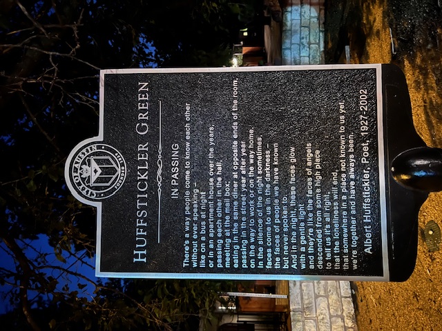 We walked to Huffstickler Green, a small tract on 38th and Duval, and stopped at the memorial for the poet laureate of Hyde Park, Albert Huffstickler. We all read the poem. When I got to the line where I knew the poem was taking off, transitioning to exultation, I recited it aloud: